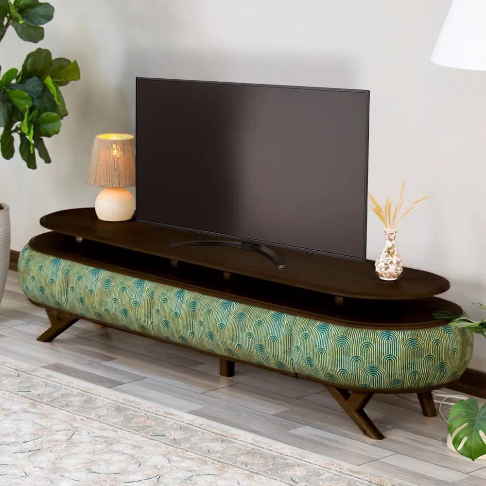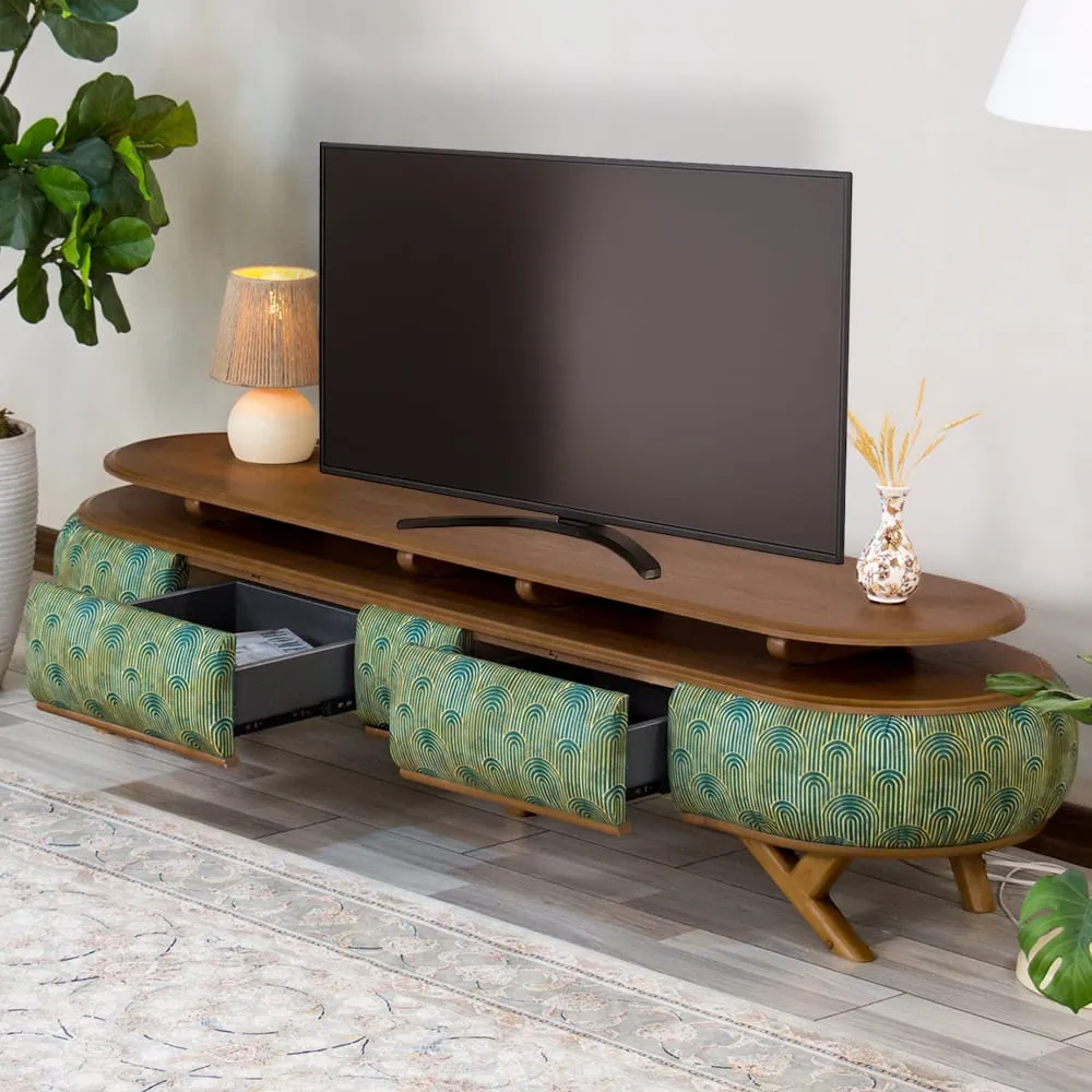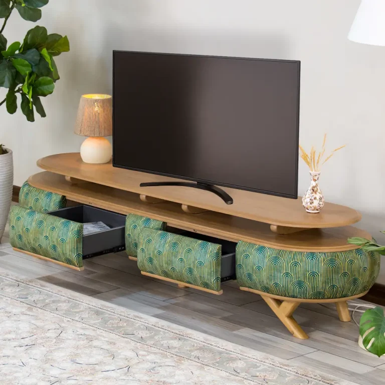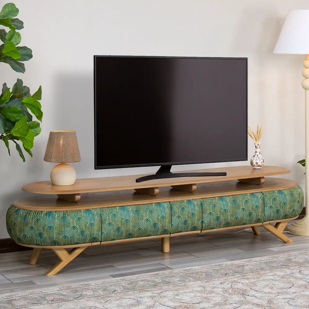 میز تلویزیون نقش آکام چوب طرح ایوان با طول ۱۹۰ سانتی‌متر، انتخابی ایده‌آل برای خانه‌هایی است که تلویزیون‌های بزرگ (۶۰ اینچ به بالا) دارند. این مدل با طراحی خاص و نقوش هندسی سبز و زرد، جلوه‌ای مدرن در عین حال اصیل به دکوراسیون شما می‌بخشد.