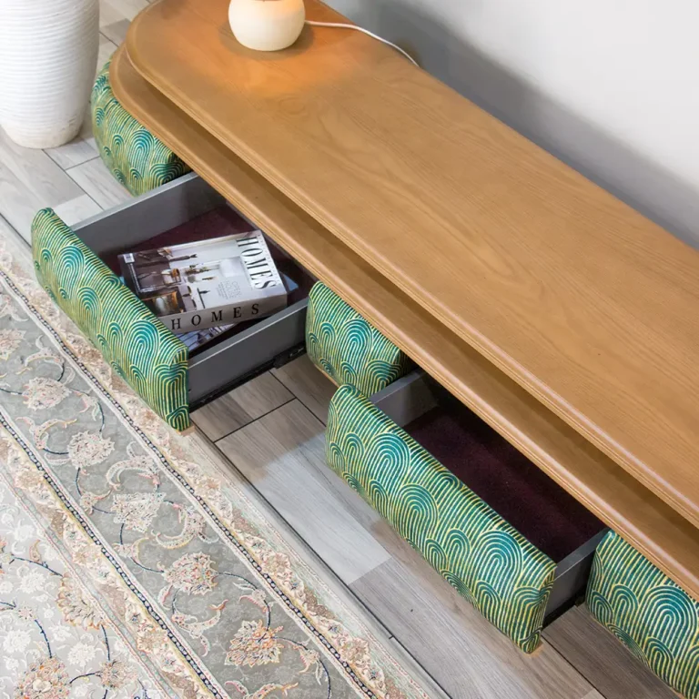 دارای دو کشوی مخفی جادار است که فضای کافی برای نگهداری وسایل ضروری مانند کنترل‌ها، کتابچه‌ها و لوازم جانبی را فراهم می‌کند. همچنین مجهز به محافظ برق داخلی برای مدیریت ایمن سیم‌ها و جلوگیری از بی‌نظمی در اطراف تلویزیون است.