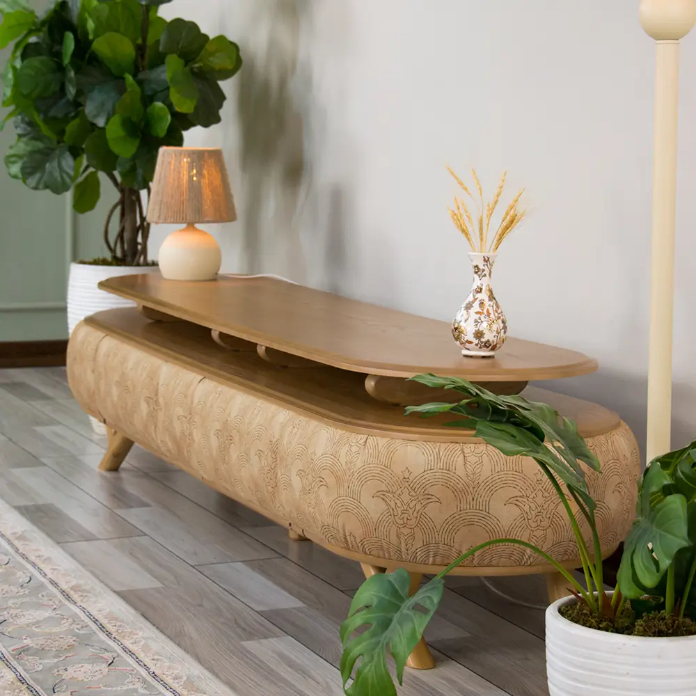 میز تلویزیون نقش طرح پارسه، جلوهای از اصالت ایرانی در قالبی مدرن است. طراحی منحنی، پارچهی مخمل طلایینقش و پایههای چوبی اریب، فضای پذیرایی را گرمتر و منظمتر میسازد. وجود کشوی کاربردی و باکس سیم داخلی، این مدل را به انتخابی هوشمندانه برای دکوراسیونهای شیک و مینیمال تبدیل کرده است.