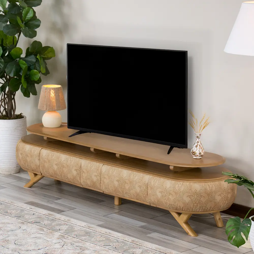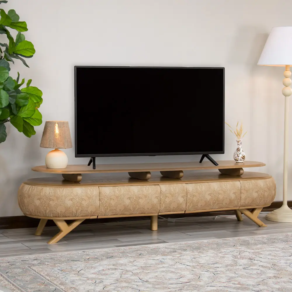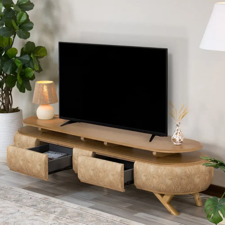 سطح چوبی مقاوم آن برای قرارگیری تلویزیونهای بزرگ تا ۷۵ اینچ طراحی شده و ۲ کشوی مخفی جادار دارد که فضای کافی برای نظمدهی وسایل جانبی فراهم میآورد. این مدل در رنگهای متنوع پایه و چوب عرضه میشود تا با سبکهای مختلف دکوراسیون هماهنگ گردد.